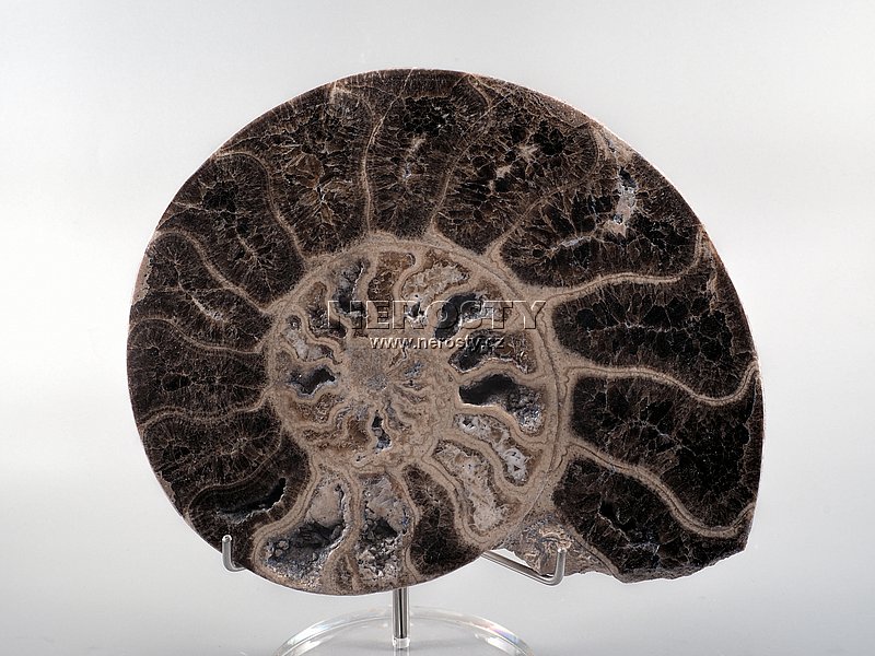 Na dvě poloviny rozříznutý a leštěný zkamenělý velký amonit choffaticeras segne.